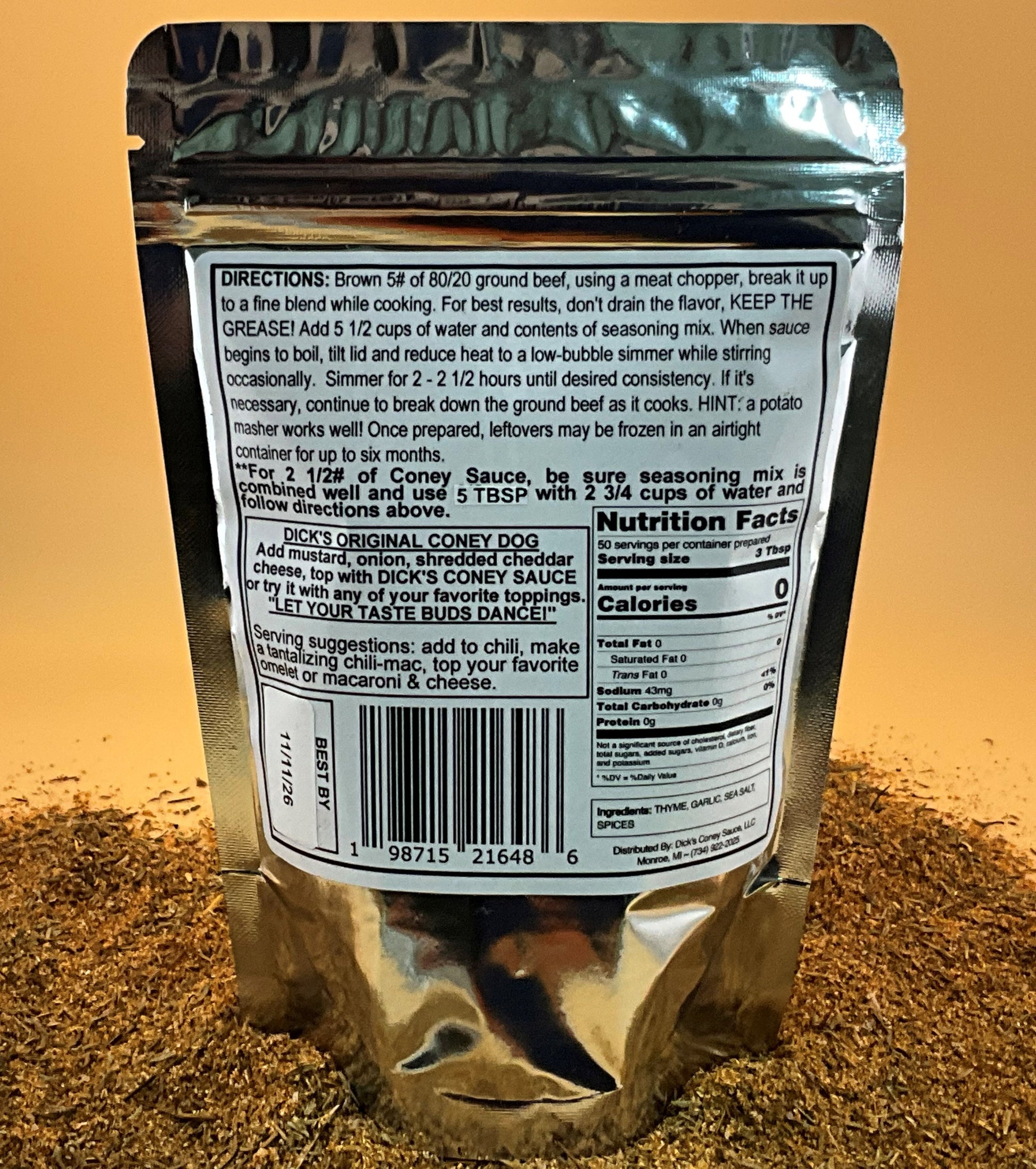 This party-sized seasoning mix produces a generous 5 pounds of mouthwatering Dick's Coney Sauce™, perfect for up to 50 Coney Dogs. You have the flexibility to make it all at once and freeze the leftovers in smaller containers for up to six months or divide it to create a smaller batch, simply mix the seasoning well before dividing it and prepare according to the directions on the package.